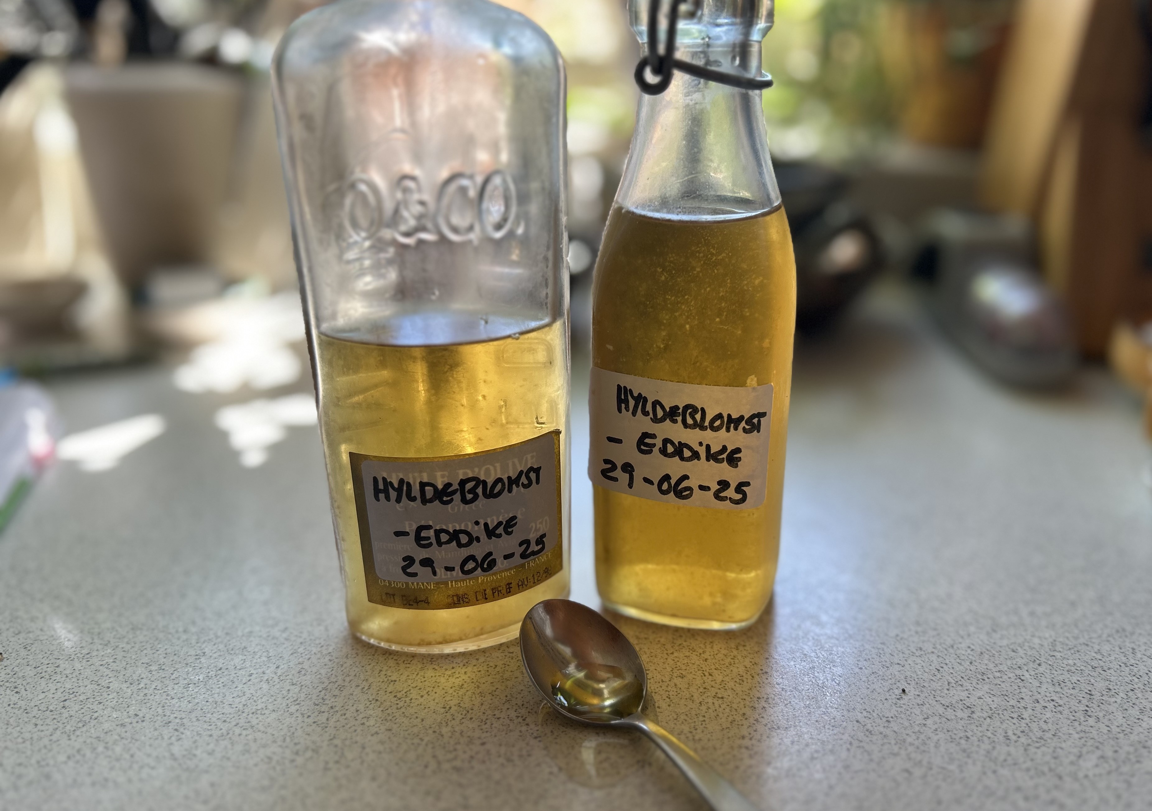 Note: Hyldeblomsteddike kan sagtens holde i mere end et år, hvis den opbevares mørkt og ikke alt for varmt.