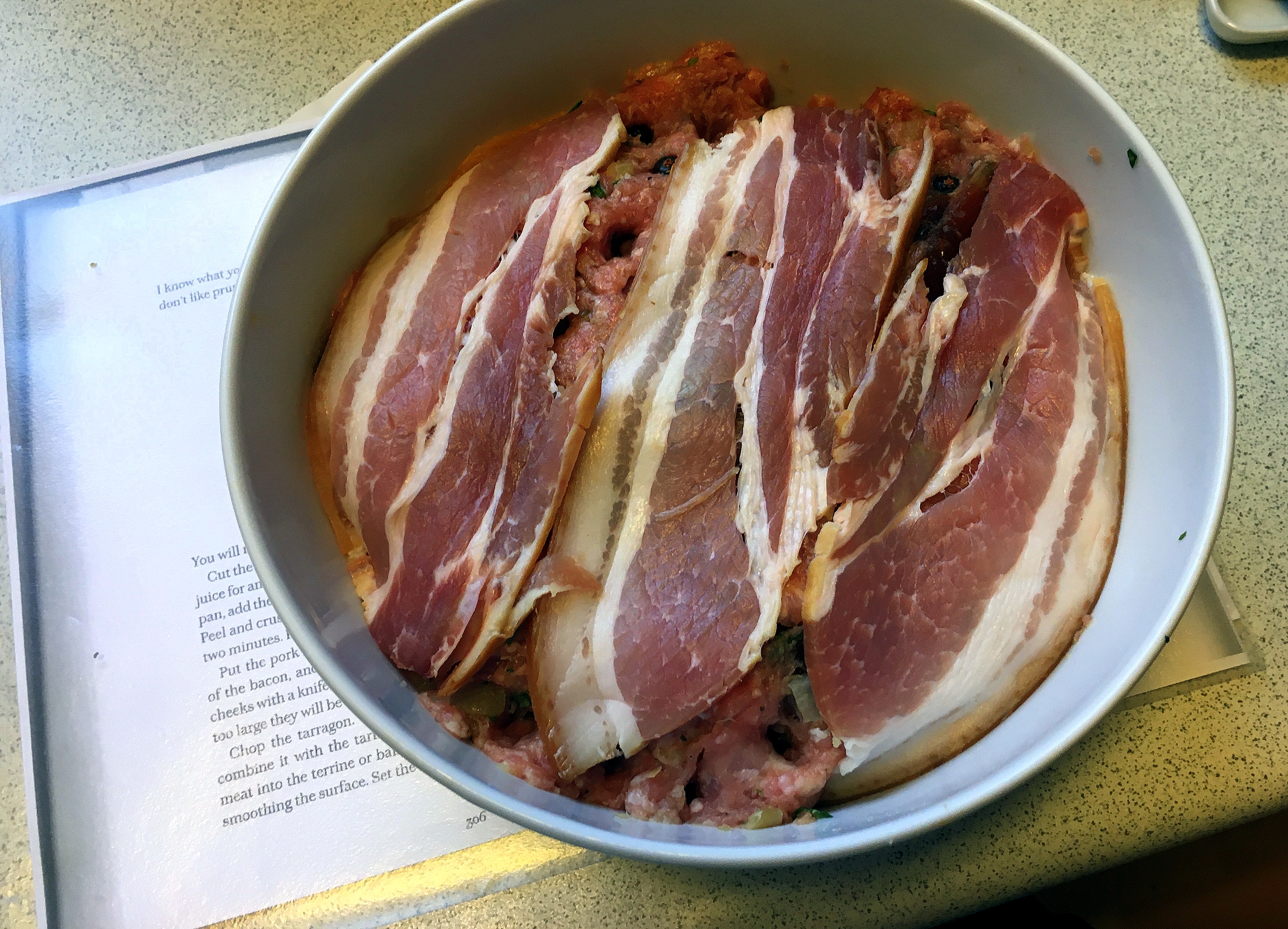 Jeg havde også forestillet mig, at den gode Nigels pate ( en “terrine”, kalder han den) måtte være toplækker, men undervejs i processen, kom jeg i tvivl. Var der nu nok krydderier? Kunne de der svinekæbestrimler virkelig smage godt nok, pakket ind i hakket svinekød? Ville sveskerne og marsalaen smage igennem? Og ikke mindst; Var halvanden time nu nok – og hvad hvis det ikke var…hvordan skulle jeg vide det, før jeg tog den ud af ovnen?