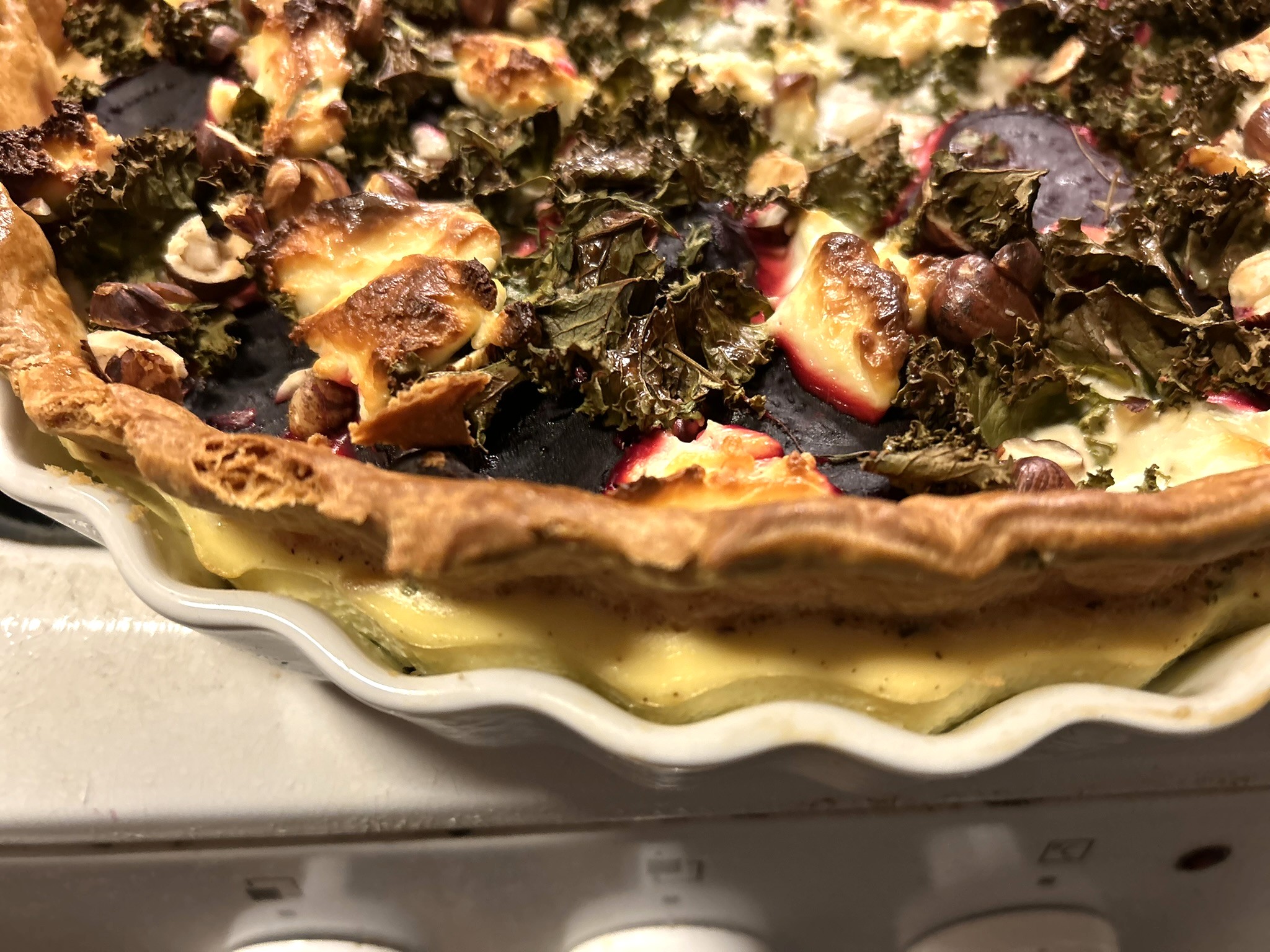Læg rødbederne på bunden af tærteskallen. Tilsæt grønkål (det gør ikke noget, hvis det stikker lidt op; de blade, der stikker op, bliver lækre og sprøde under bagning). Fordel gedeost og hakkede hasselnødder jævnt over.