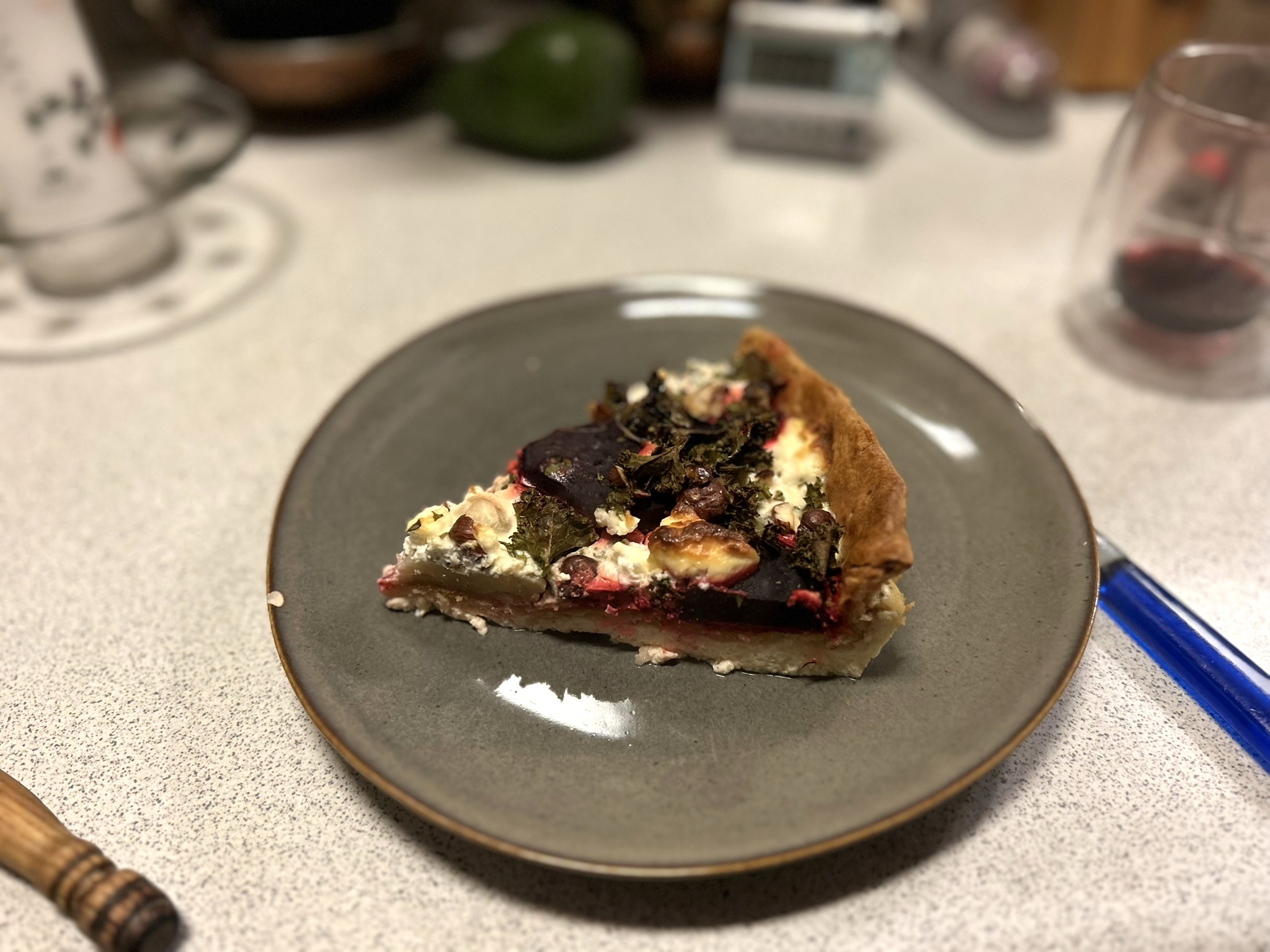 Note: Det er IKKE (heller ikke selvom man køber dejen færdig, hvad jeg ikke vil råde til – se ovenfor) en tærte, man så¨dan lige klapper sammen på en times tid. Hviletid til dejen, bage rødbederne, lad dem køle af – og bagningen af selve tærte…jeg tror, det alt i alt tog omkring 4 timer.