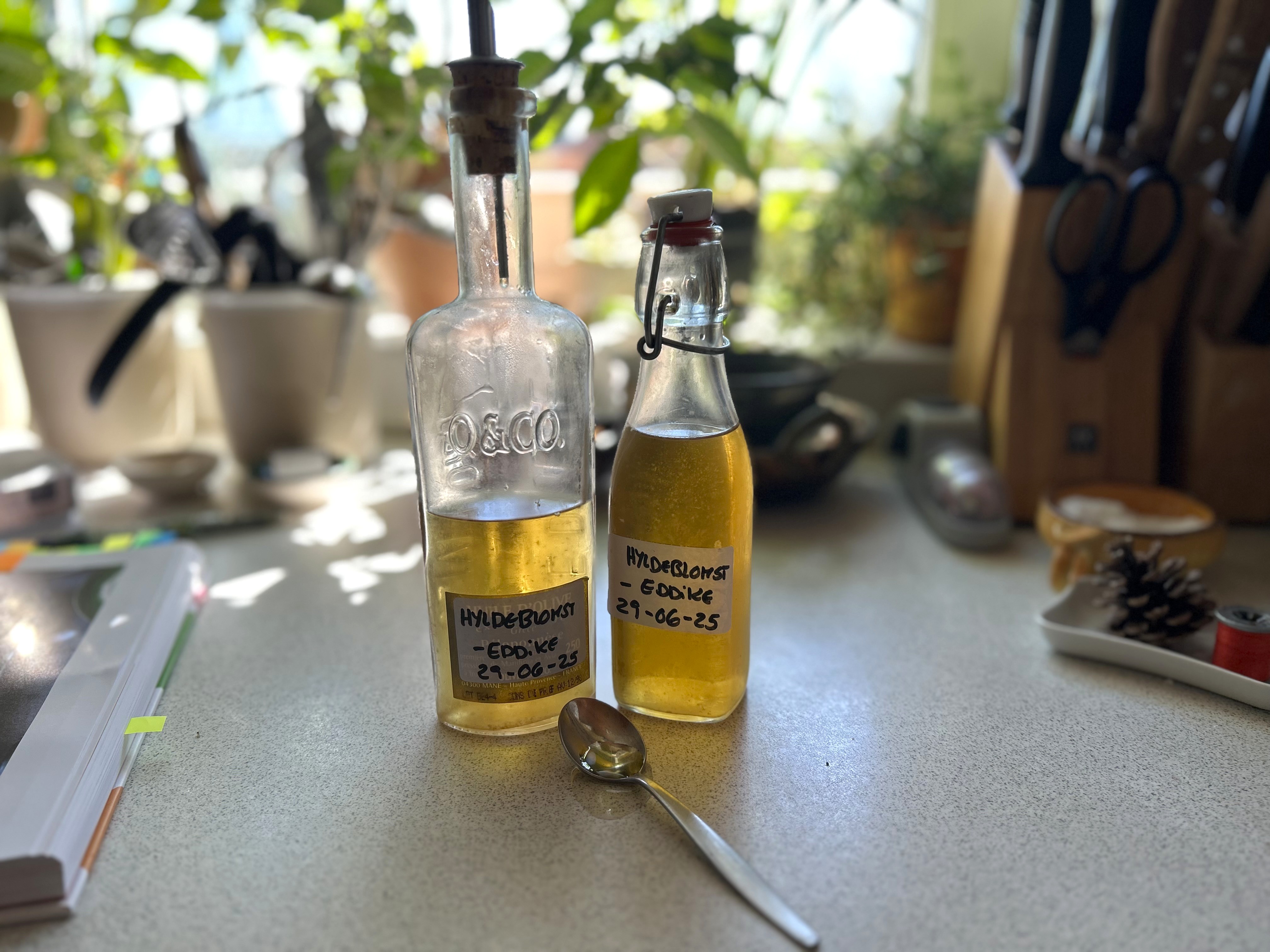 En eller anden skrev om hyldeblomsteddike, og jeg – der lige havde været ude hos min søster og set hendes store blomstrende hyld – tænkte: “Det vil jeg da lave”! Jeg ringede til søster, der ville plukke nogle hoveder, skylle dem og løsfryse dem til mig.