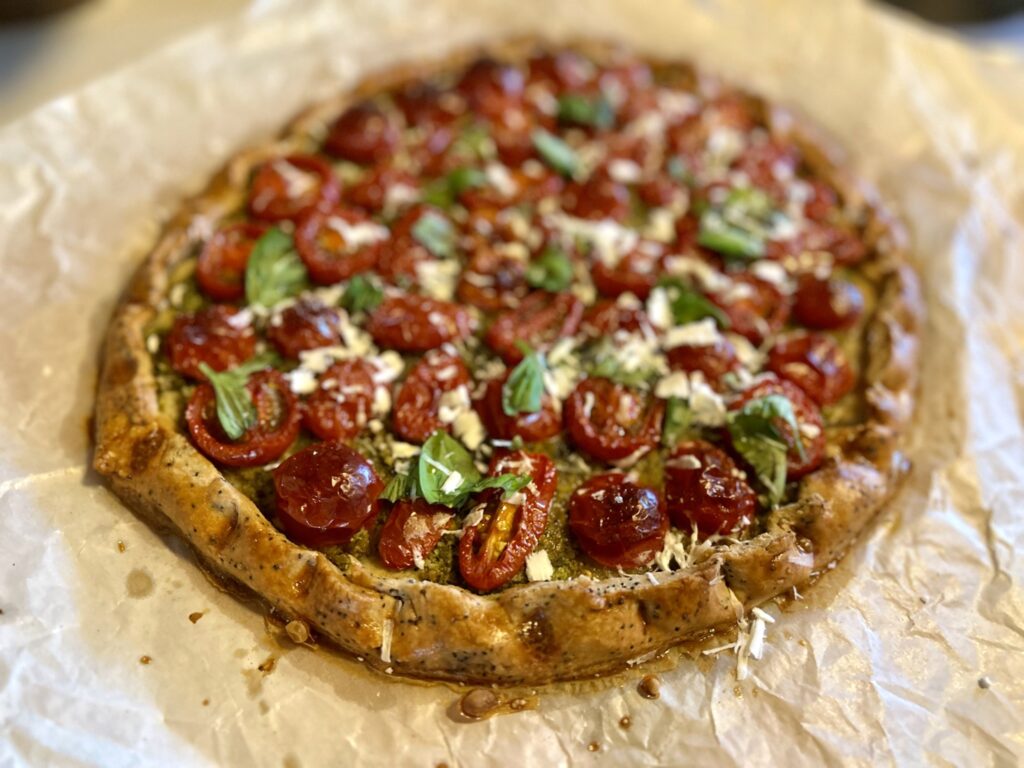 Den her tomattærte lavede jeg forleden, og jeg var supertilfreds med den! Ikke bare er den smuk, men den smager også godt. Dog vil jeg påpege, at det ikke er fast food – det tog mig over to timer alt i alt at få den klar til middagsbordet.